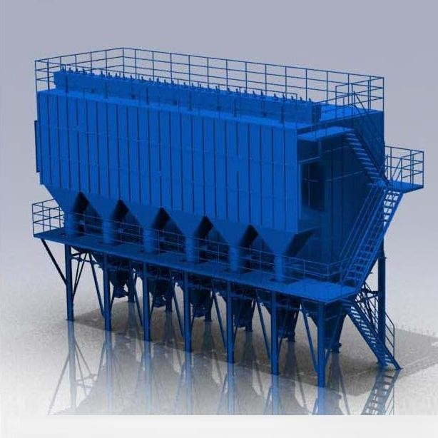 低壓脈沖袋式除塵器的氣體凈化方式為外濾器。含塵氣體從導(dǎo)向管進入各單元過濾室。在設(shè)計中,由于濾袋底部與進氣口上部有足夠的垂直距離,通過適當(dāng)?shù)膶?dǎo)流和自然流動方向,合理的氣流分布可以在整個過濾室內(nèi)實現(xiàn)均勻的氣流分布。含塵氣體中的粉塵顆粒經(jīng)自然沉降分離后直接落入灰斗內(nèi),其馀的粉塵在導(dǎo)流系統(tǒng)的引導(dǎo)下直接落在灰斗中。隨著空氣的流動進入過濾區(qū)的中間箱,吸附在過濾袋的外表面。過濾干凈的氣體通過過濾袋通過上箱,排氣管排出。